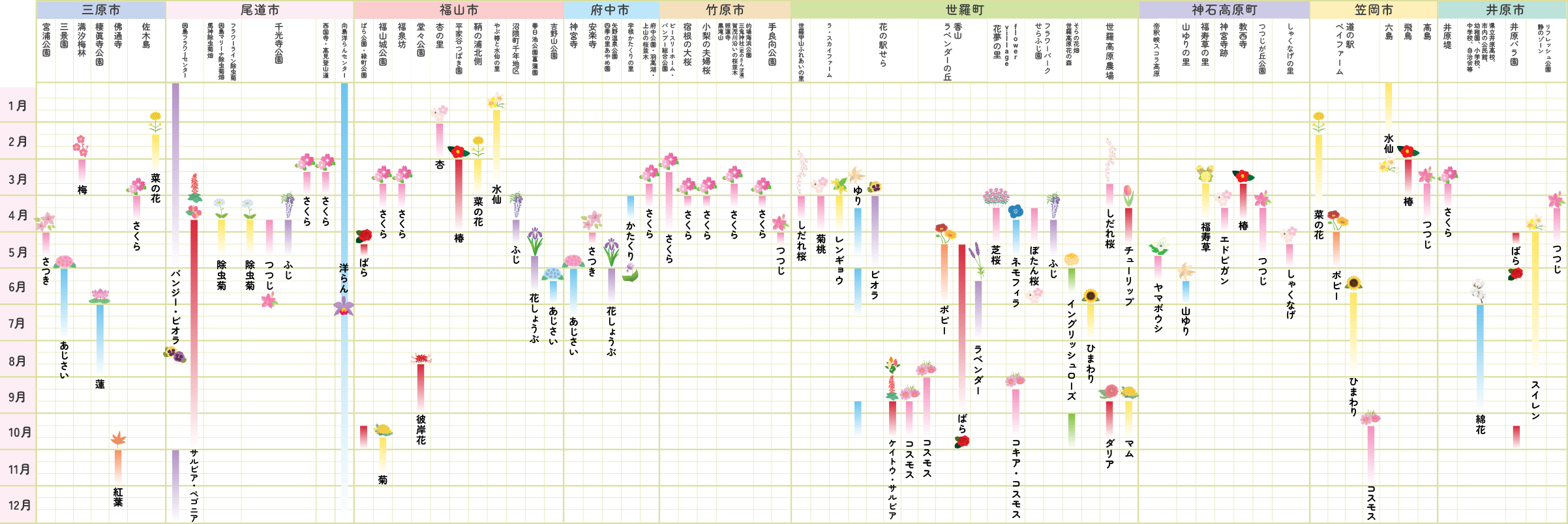 備後圏域を訪れた皆さんや住民の方々に、1年を通してこのまちの美しさに触れていただけるよう、四季折々の花スポットをまとめました。