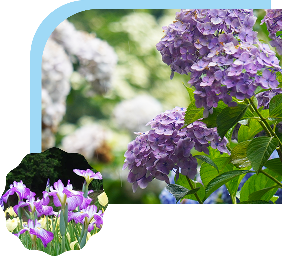 80種3,000株のあじさいを鑑賞できる神宮寺のあじさい、色とりどりの3,000株のさつきが楽しめる安楽寺のさつき、薄紫の可憐なかたくりの花が山腹一面に咲く宇根かたくり、紫の華やかな色がつく矢野温泉公園四季の里の花しょうぶなど、府中市のたくさんの場所でお花を楽しむことができます。