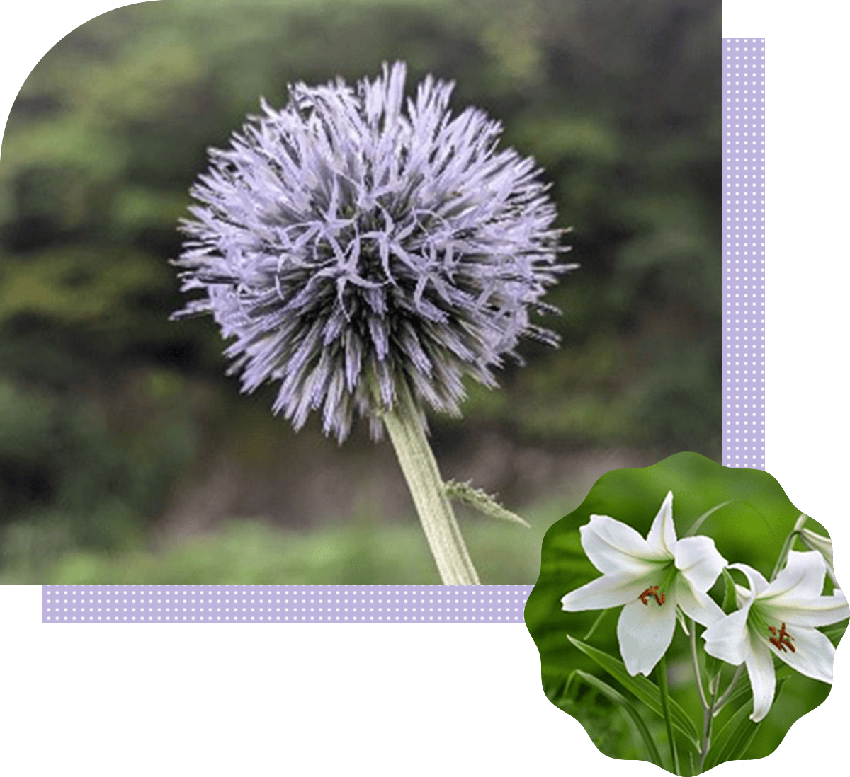 瑠璃色の小さな花が集まり、球体に5センチほどのかわいい花を咲かせる。