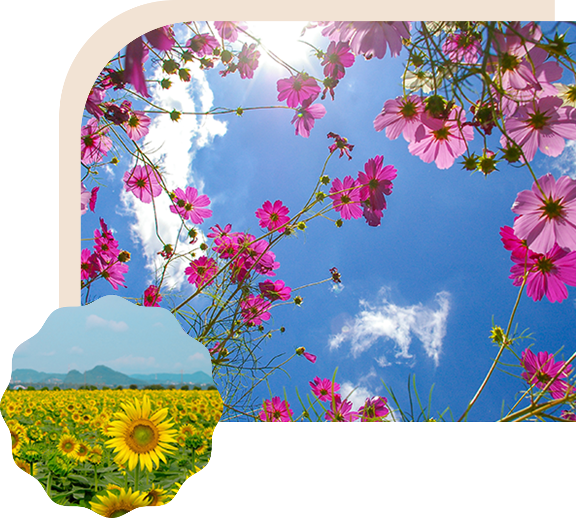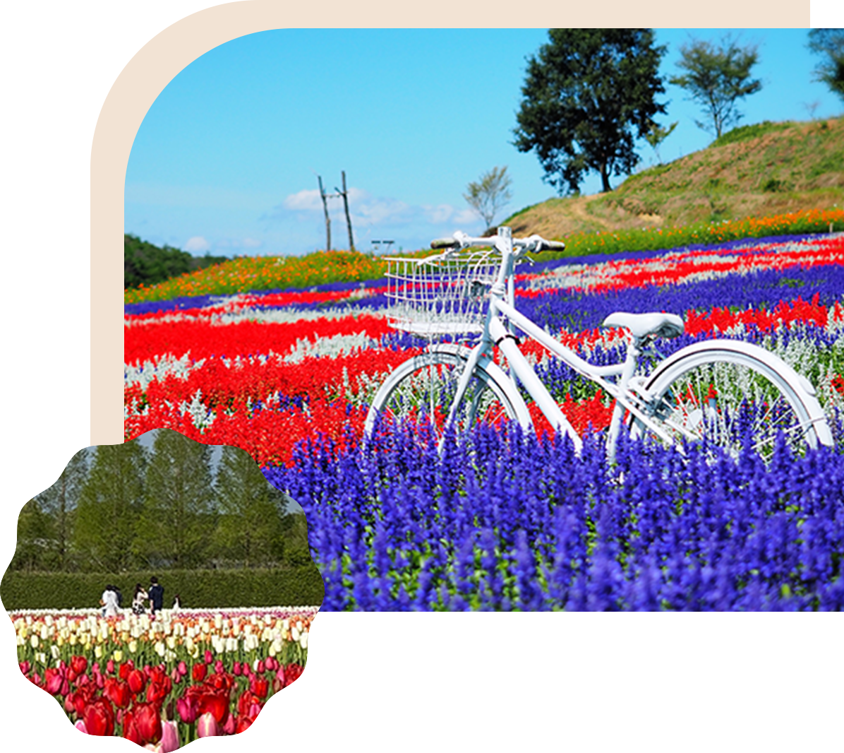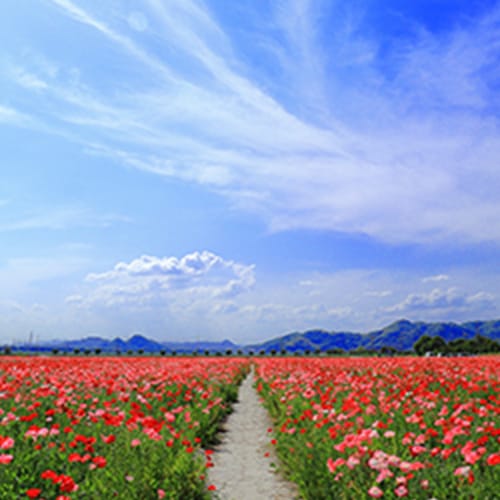 花農園が7か所あり、各農園ではさまざまに咲き誇る美しい花景色を四季折々に楽しむことができる世羅町。