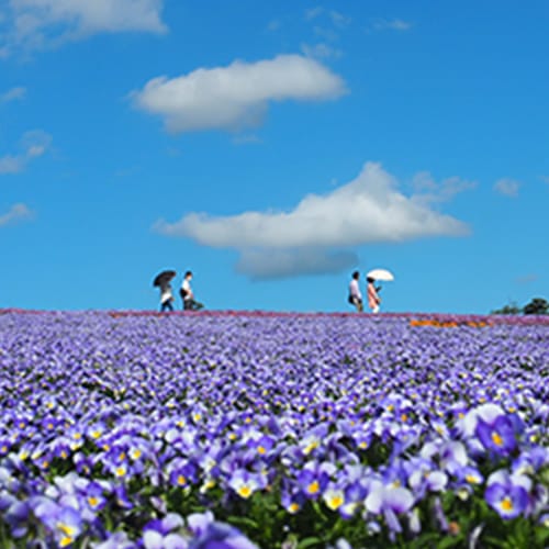 青空の下、一面に広がる鮮やかな花のじゅうたんは、ため息が出るほどの美しさ。